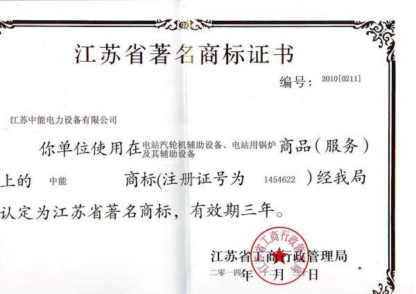 江苏省著名商标证书